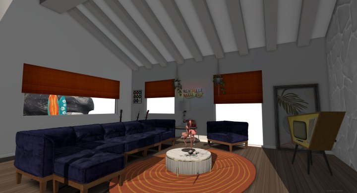 Retro rug, marble coffee table, lamp, flamingos, neon sign and floor print from Kraftwork