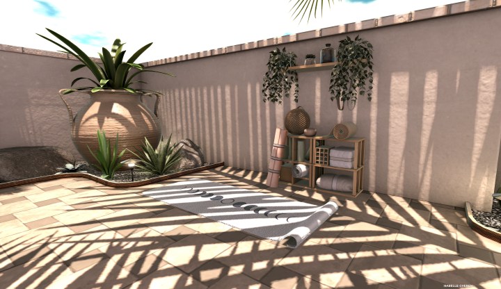 I set up a whole yoga corner from Chez Moi. The shelving, plants, mat rolled out, the full “I’m a person who has namaste etched in my soul vibes”